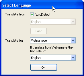 rồi chọn Language: Auto (en-vi), sau đó trong mục Translate to bạn hãy chọn ngôn ngữ mà bạn muốn dịch qua (với người Việt Nam thì bạn chọn là Vietnamese), nếu bạn sử dụng thành thạo một ngôn ngữ khác nữa thì trong khung If translate from Vietnamese then translate to bạn hãy chọn ngôn ngữ ấy rồi nhấn OK để xác nhận chọn lựa.